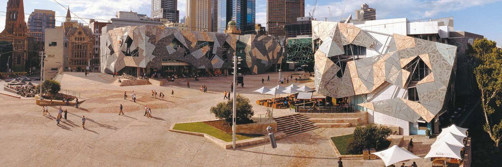 Federation Square sits in the middle of Melbourne, inside the inner city, and includes two large public spaces within its clutches.